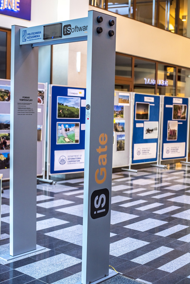 Bramki do zdalnego pomiaru temperatury to jeden z elementów ochrony stosowanej na Politechnice Rzeszowskiej, używany z uwagi na wysoki poziom zagrożenia wynikający z bezpośrednich kontaktów międzyludzkich. System zaprezentowany przez firmę InfoSoftware Polska nie tylko umożliwia kontrolę temperatury ciała, lecz także pozwoli na prowadzenie dalszych badań w zakresie efektywnej i bezpiecznej komunikacji, zdalnego monitoringu i sterowania zasobami w heterogenicznym rozproszonym środowisku.
