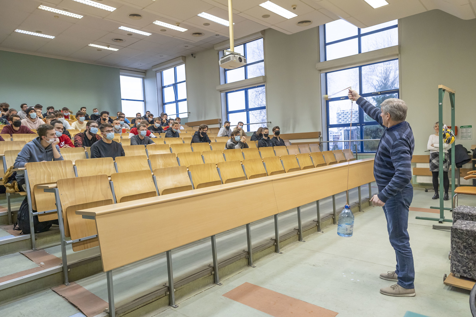 Innowacja ta była możliwa, ponieważ od obecnego roku akademickiego większość zajęć wykładowych z fizyki realizowana jest w jednej sali wykładowej (S2) przygotowanej do prowadzenia demonstracji. Mamy nadzieję, że tego typu zajęcia na stałe zagoszczą w murach Politechniki Rzeszowskiej.