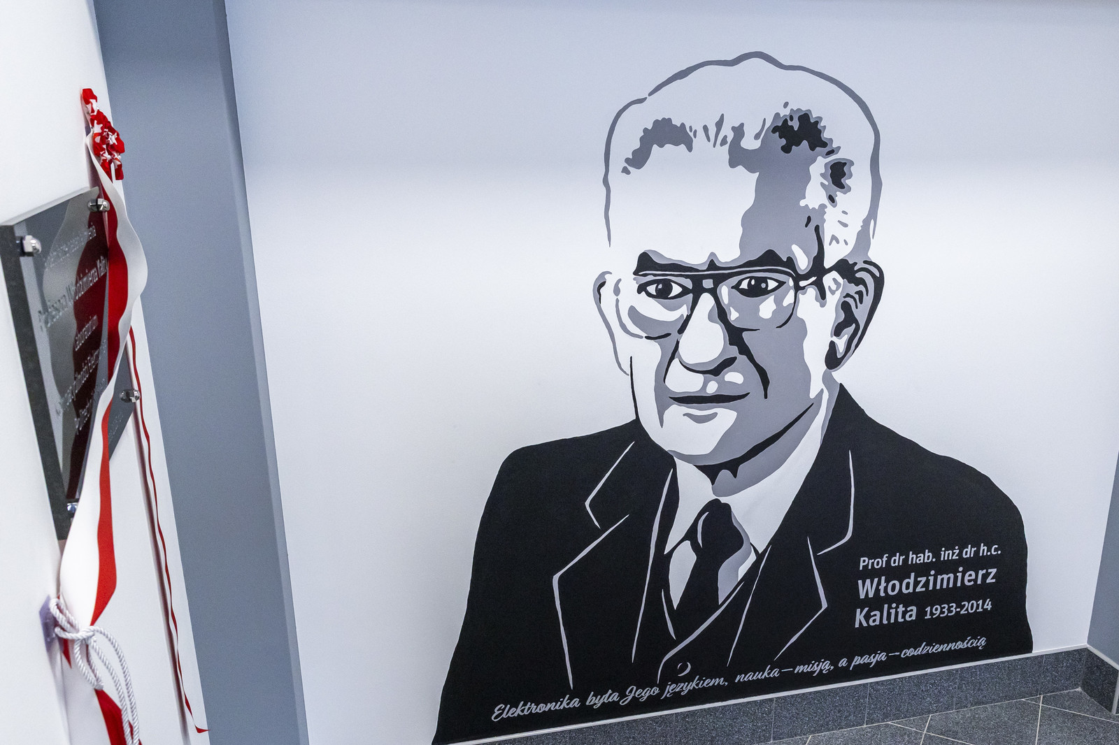 Na pamiątkę nieocenionych zasług prof. Włodzimierza Kality dla uczelni, wydziału oraz zakładu rektor prof. Piotr Koszelnik z Zofią Kalitą dokonali symbolicznego odsłonięcia tablicy pamiątkowej, która razem wizerunkiem Profesora uwiecznionym na muralu na długie lata pozostanie inspiracją dla obecnych i przyszłych członków społeczności akademickiej do angażowania się w rozwój i promowanie Politechniki Rzeszowskiej.
