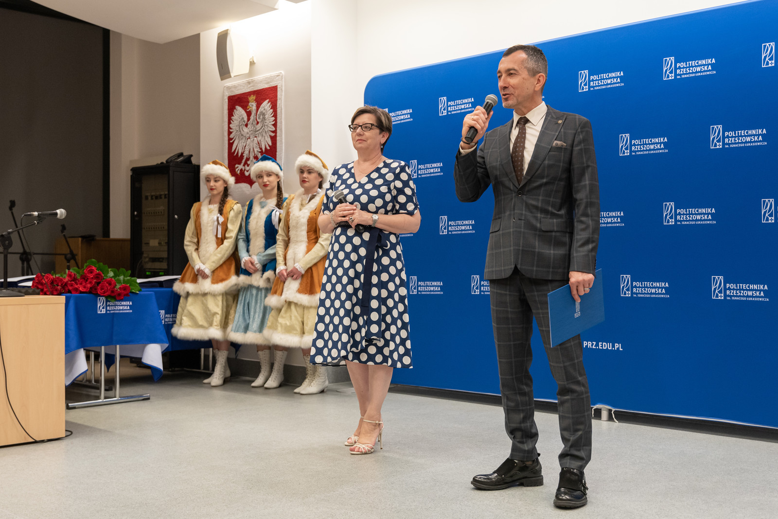 Uroczystość rozpoczęła się miłym artystycznym akcentem, jakim był występem wokalny dwóch wyróżnionych studentek z Wydziału Matematyki i Fizyki Stosowanej – Katarzyny Bieli i Klaudii Bukały. Następnie prorektor ds. kształcenia dr hab. Iwona Włoch, prof. PRz i prorektor ds. studenckich prof. dr hab. Grzegorz Ostasz wręczyli nagrody i lity gratulacyjne studentom. „Razem z panią prof. Iwoną Włoch mamy ogromną satysfakcję, wręczając w imieniu JM Rektora nagrody tak licznej grupie studentów naszej Politechniki. Wyróżnieni zostali nie tylko przedstawiciele wszystkich wydziałów, ale też liderzy Samorządu Studenckiego oraz grupa sportowców reprezentująca Akademicki Związek Sportowy. Wszyscy Państwo świetnie pokazaliście, że można łączyć obowiązki studenta z prawdziwą pasją na różnych płaszczyznach. Serdecznie wszystkim gratulujemy" - powiedział prof. G. Ostasz.