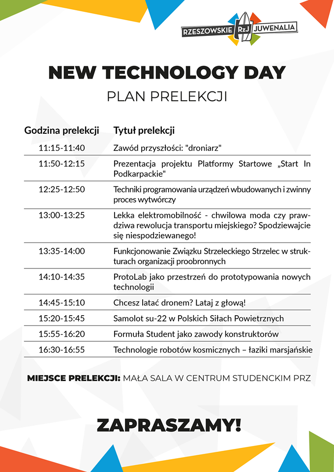New Technology Day to nowa propozycja w ramach Juwenaliowego Mixu Wydarzeń dla wszystkich zainteresowanych nowymi technologiami, branżą systemów bezzałogowych, rozwiązaniami przyszłości czy tworzeniem innowacyjnych produktów i usług. Wydarzenie odbędzie się 16 kwietnia od godziny 11.00 do 17.00 w Centrum Studenckim Politechniki Rzeszowskiej.
